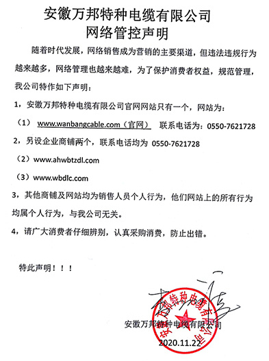 鄭重聲明:安徽萬邦特種電纜有限公司官方網站為:www_wanbangcable_com.fhdog.com,除此之外無任何子網站或合作網站,其余均為假冒偽劣。電話:0550-7621728 13485756353 地 址:安徽省天長市滁州高新技術產業開發區經四路29號